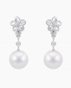 South Sea Pear Earring with Rose cut Diamonds 2.84carats with side Diamonds of 0.59 carat in 18k White Gold 7.93grams.