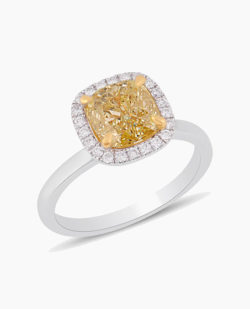Diamond Ring set with Fancy Yellow cushion shape Diamond 2.00carats with side Diamonds of 0.17carats set in Halo setting in 18k white gold 3.83grams.