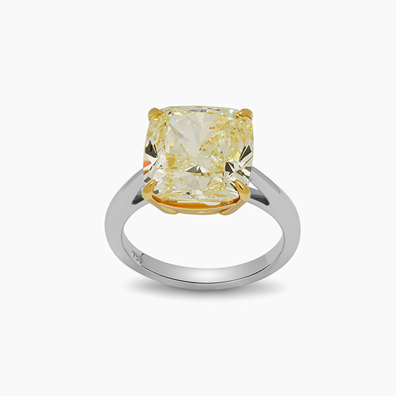 A Fancy Yellow color Cushion shape Diamond 8.53 carats in classic four prong high setting in 18k white gold 3.95 grams.