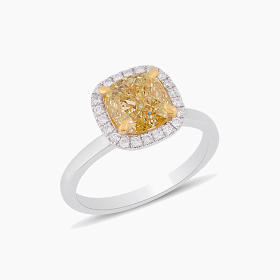 Diamond Ring set with Fancy Yellow cushion shape Diamond 2.00carats with side Diamonds of 0.17carats set in Halo setting in 18k white gold 3.83grams.